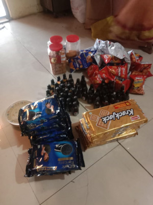 Distribution of cream roll, toast, wafers, apple juice, biscuits to more than 50 kids.
