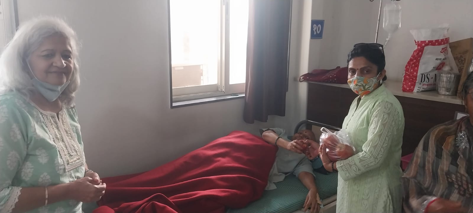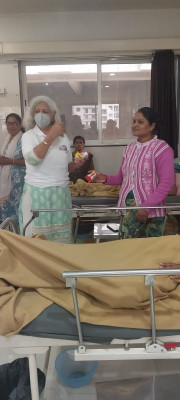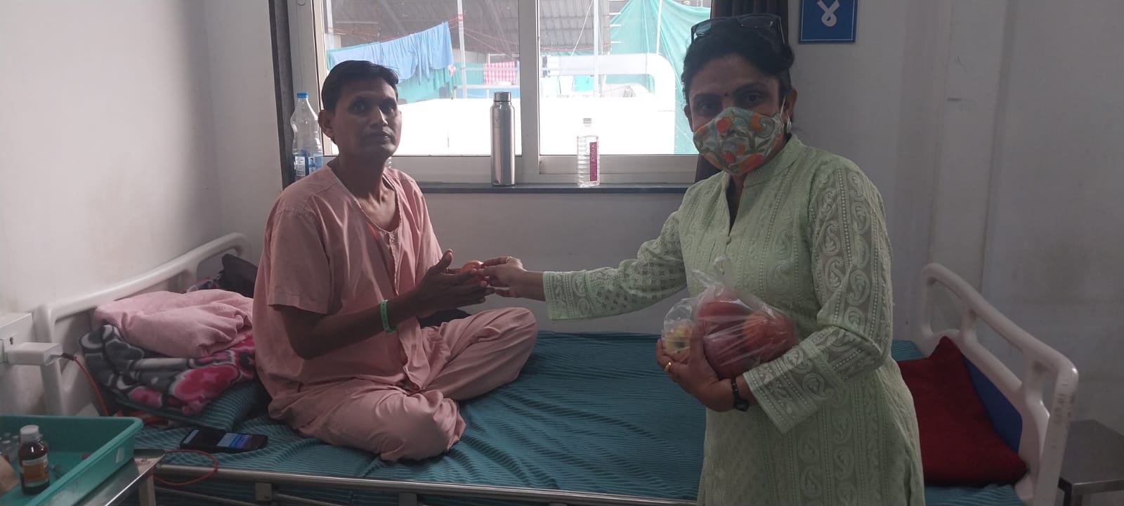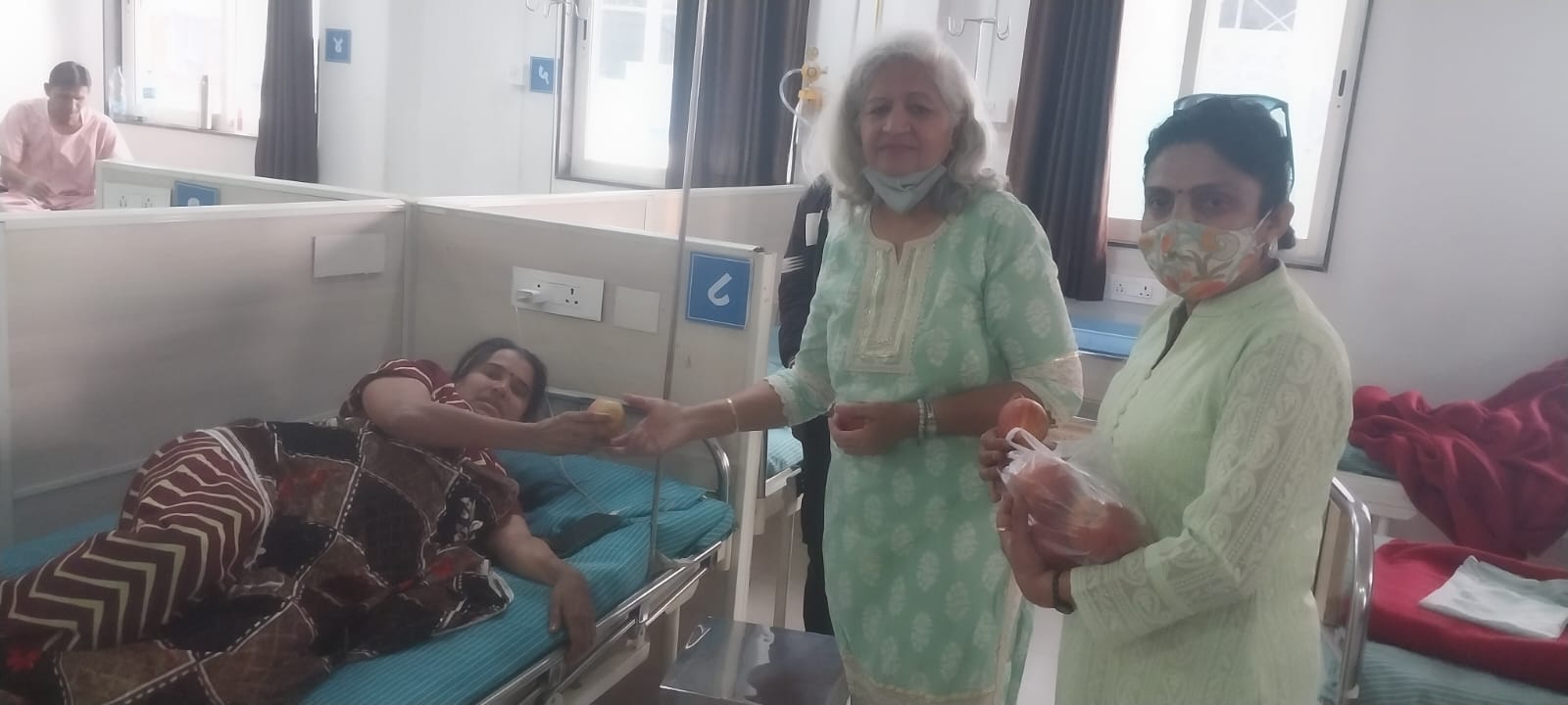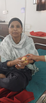 Distribution of apples, dates, samosa and biscuits to 50 patients and their relatives
