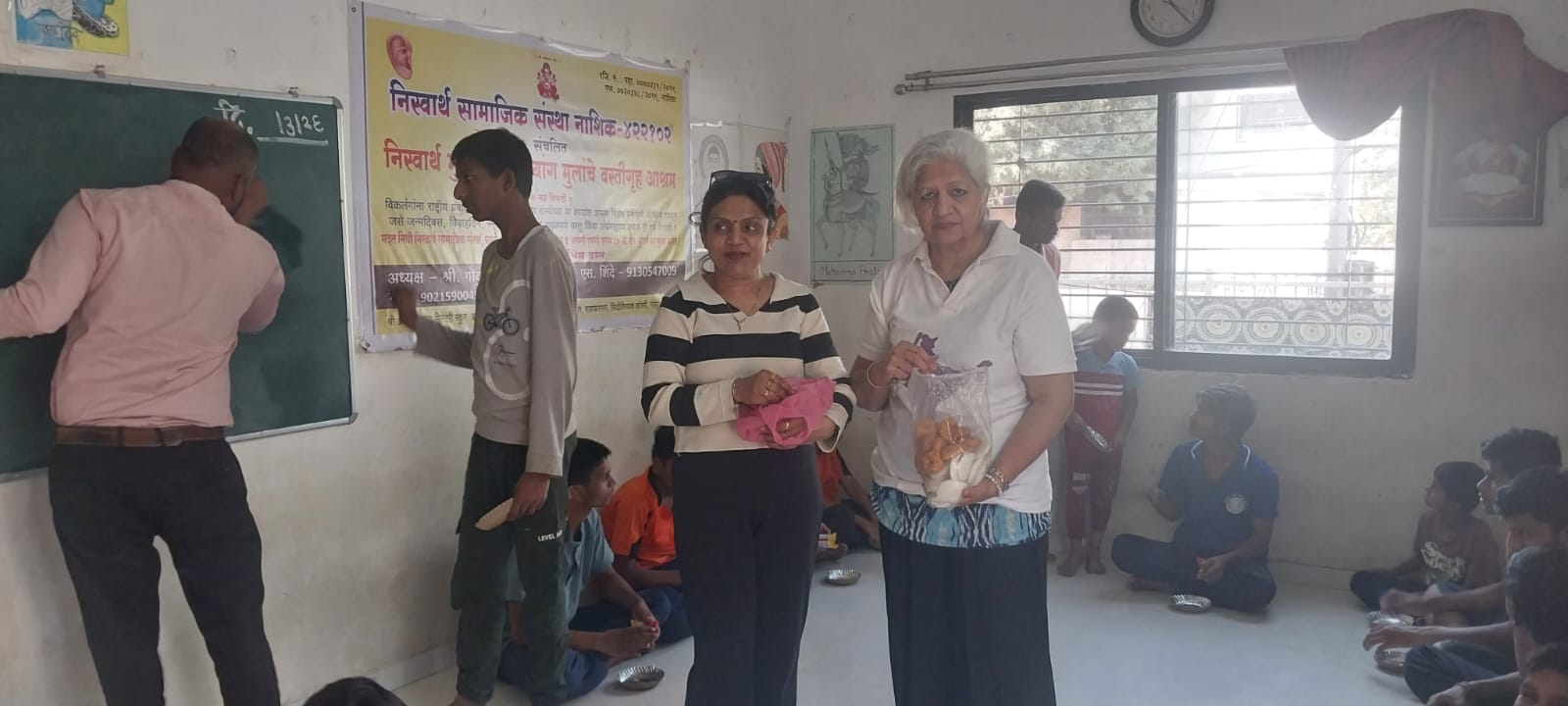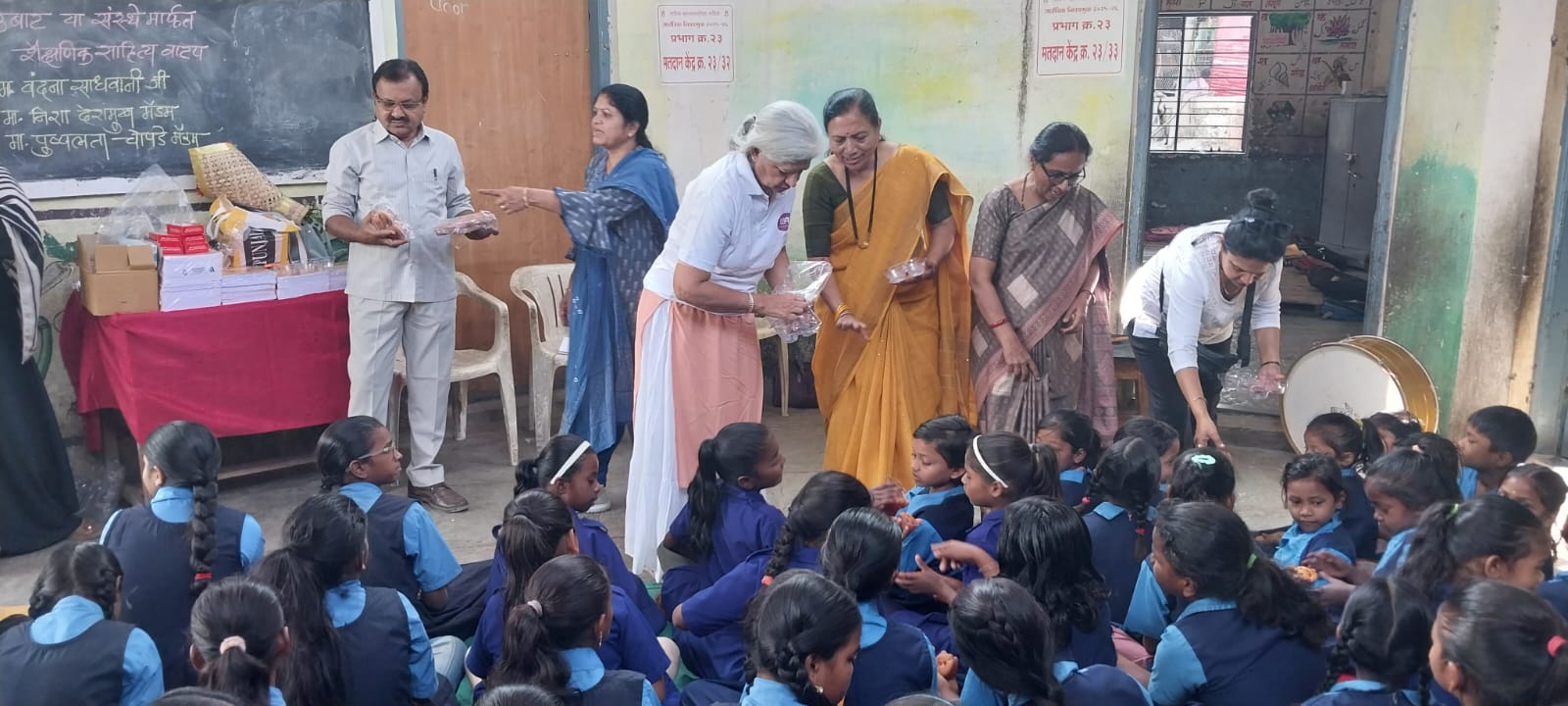 Distribution of noodles, manchurian, biscuits, chocolates, black board.