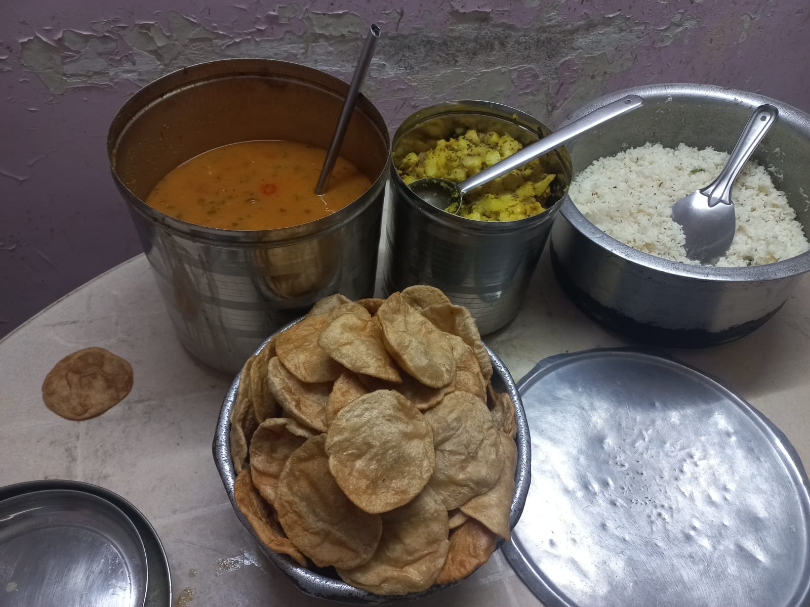 Fed full meal, Comprising various items such as Puri bhaji, dal rice, papad, usal, sweets.